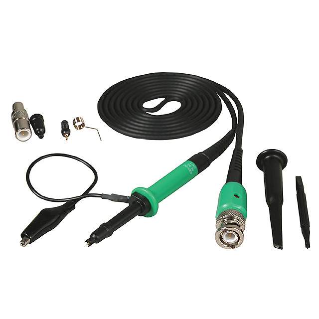 include BNC Adapter, Ground Lead, Insulating Tip, Sprung Hook, Rings, Trimmer Tool Descrizione dettagliata 10:1 Passive 200MHz 47.244" (1200.00mm) Black and Green Oscilloscope Probe Test Lead 10M Input Resistance CAT II 300V